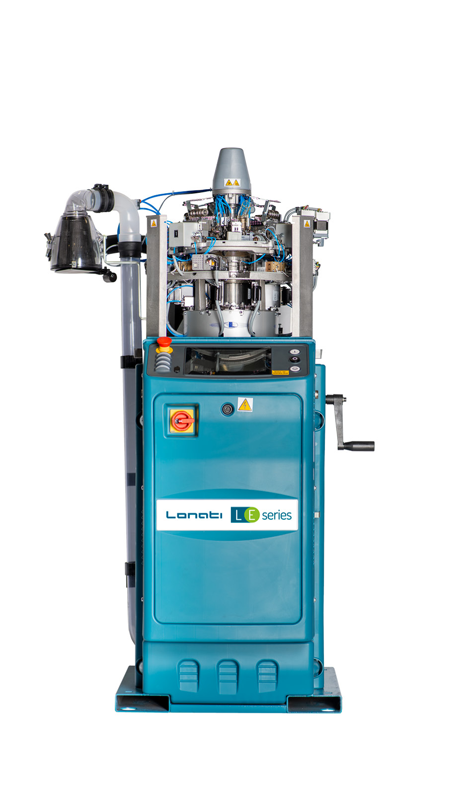 Electropneumatic single cylinder machine with 4 feeds plus 2 extra feeds for pattern and 6 needle-needle selection pattern electronic units. 5 yarnfingers with dual pneumatic control for each feed, 1 motorized plating yarnfinger with pneumatic control for angular movement and 2 pneumatic controls to set height and depth. 2 yarnfingers each extra pattern feed. Stitch cams motorized for gradual or partial stitch narrowing or widening in any part of the sock. Pantyhose option with 2 feeds, with 3 colors each course, cut-boss (jacquard relief), single or double dial jacks. Electronic device to maintain the size at any temperature of the machine