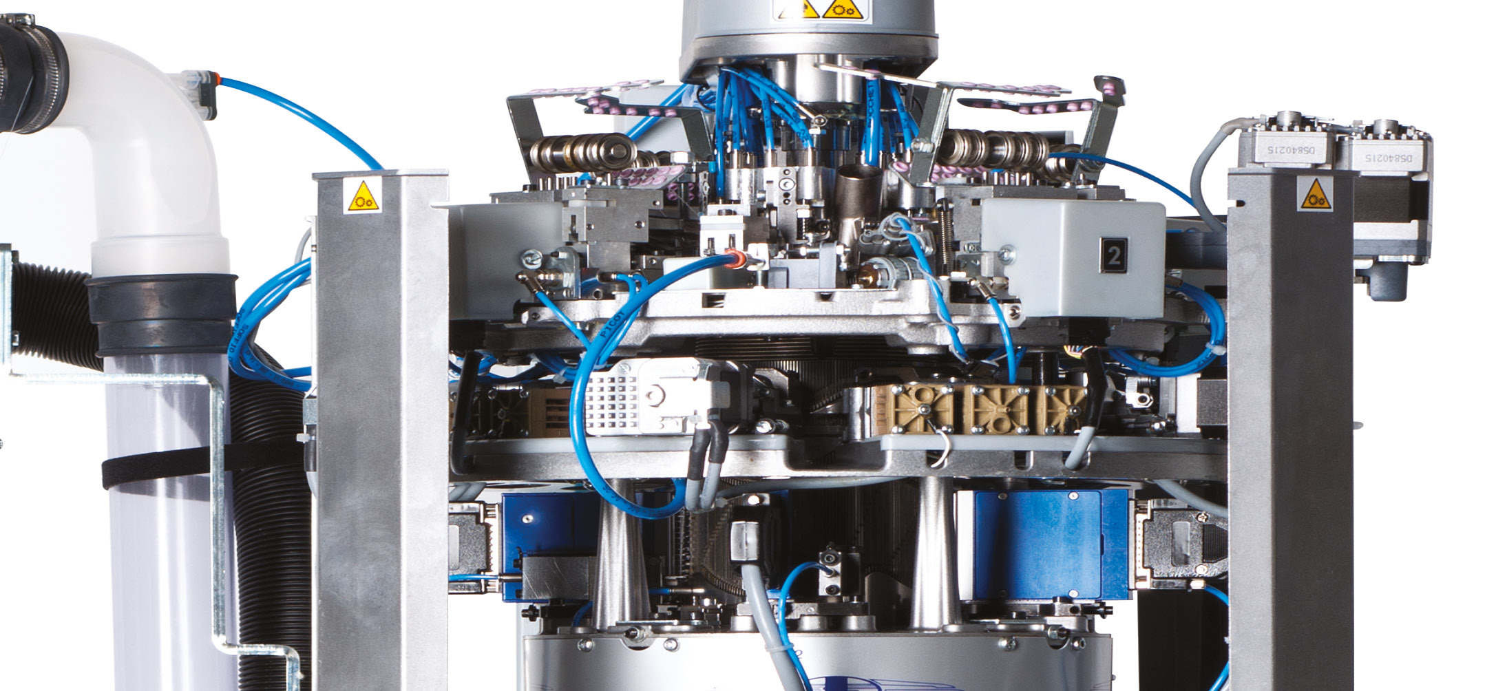 Electropneumatic single cylinder 4 feeds machine for the production of knitted fabrics in natural fi bers (cotton, wool, etc) with 1 needle-needle selection unit on each feed (4 in total) for the production of pantyhose and knee high with baguette, tucked and jacquard pattern. 5 yarnfi ngers with dual pneumatic control are available on each feed plus one plating motorized yarnfi nger for angular movement and 2 pneumatic control for height and depth. Stitch cams are controlled by stepper motors to tighten or loosen stitches gradually or partially in any part of the sock. Mobile stitch cams to produce pantyhose and knee high with 2 colors on each course, cut boss. Single or double dial jacks. Electronic device to maintain size at any temperature on the machine.